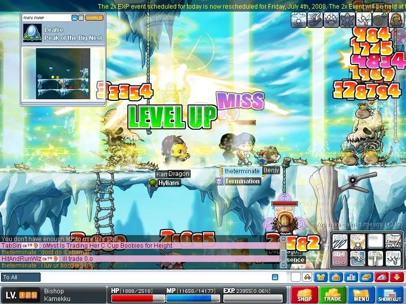 I got somewhere between 200 and 1k exp from the kills, it was Manon & Griffey in ch 1 Henesys. I got 1/1'd once and Dispelled 3 times, but amazingly stayed alive for the whole thing.